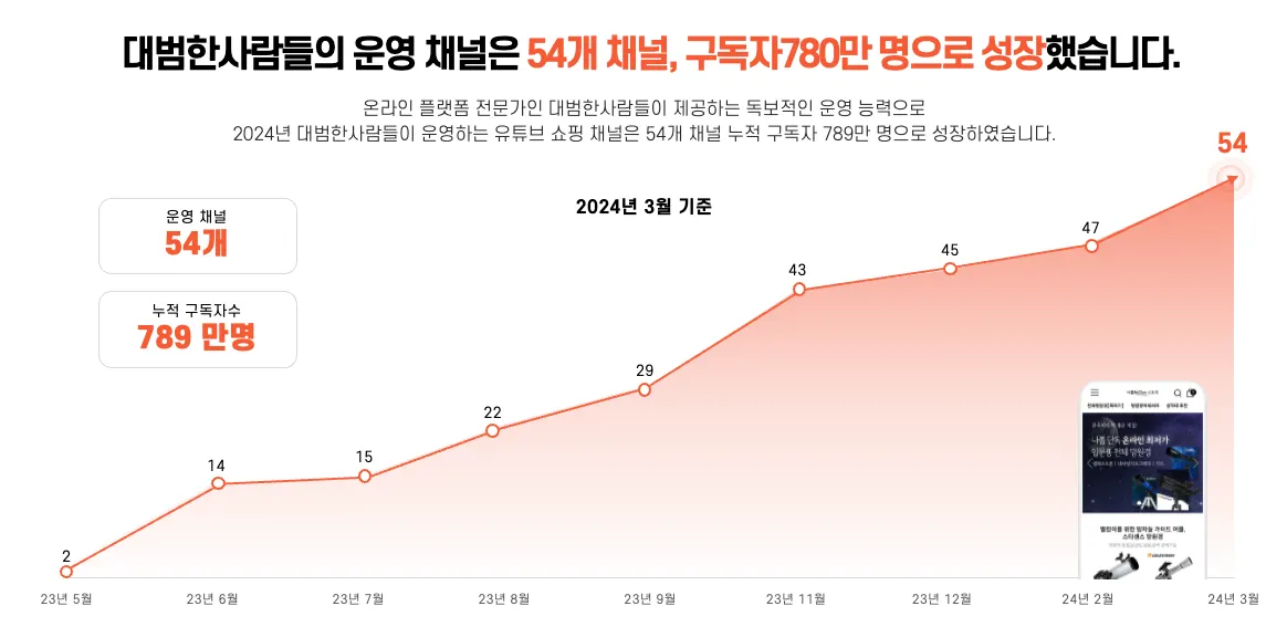 2024년 대범한사람들은 누적 구독자 789만명을 대상으로 하는 유튜브 54개 채널의 비즈니스를 지원해 드리고 있습니다.